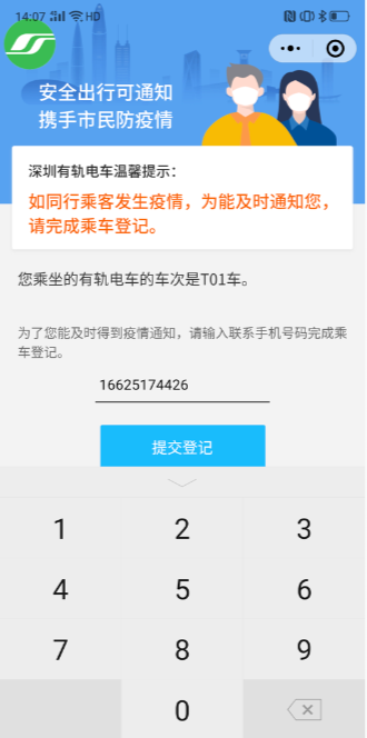 第一步:乘客使用微信扫描列车车厢内的登记码,登记页面会自动显示上次登记的手机号或在“深圳通+”小程序中注册的手机号码: