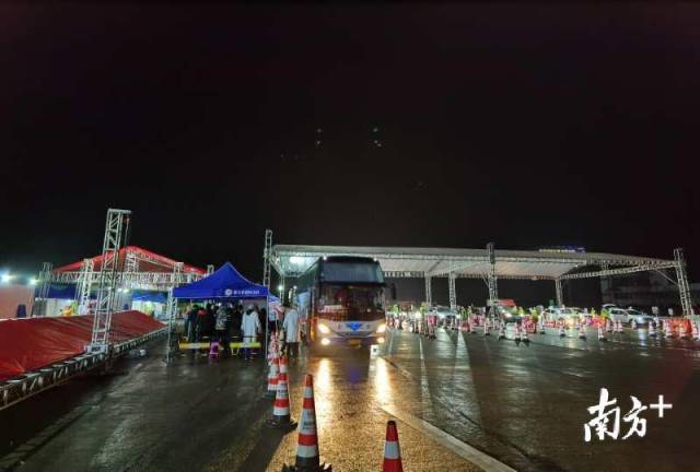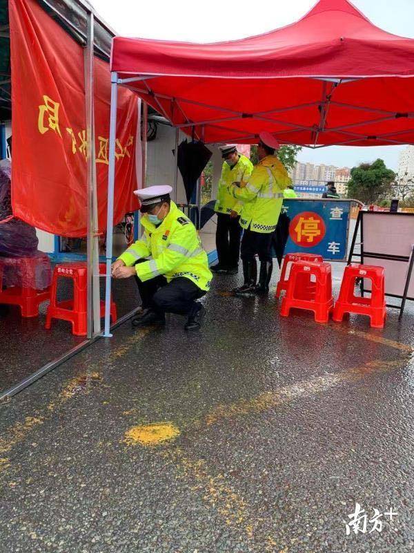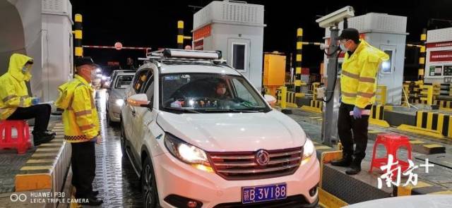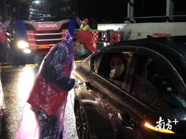 龙城街道党员干部、工作人员与龙岗区退役军人义工队、龙岗交警组成防控队伍,借助现场高速雨棚的遮挡,对进深车辆一一进行排查。