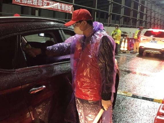 宝安区罗田检疫站指挥部总指挥,石岩街道党工委副书记、人大工委主任邓亚虎,石岩街道副主任林志明和罗田交通联合检疫站临时党支部党员冒雨检查。当晚,深圳市公安局经侦支队支援4名民警在现场冒雨防疫检查。