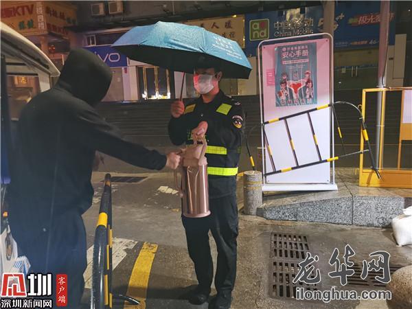 见圳客户端·深圳新闻网2月16日讯(记者 杨维易 通讯员 伍秋蔚)2月15日晚上,寒潮来临,大雨又降温。为确保防疫一线人员能够在恶劣的天气中安心值班值守,福城街道为各值守点值守人员配发雨伞、保暖大衣、一次性手套等防雨保暖物资,还送上姜茶、汤圆,让前线工作人员暖身暖心。