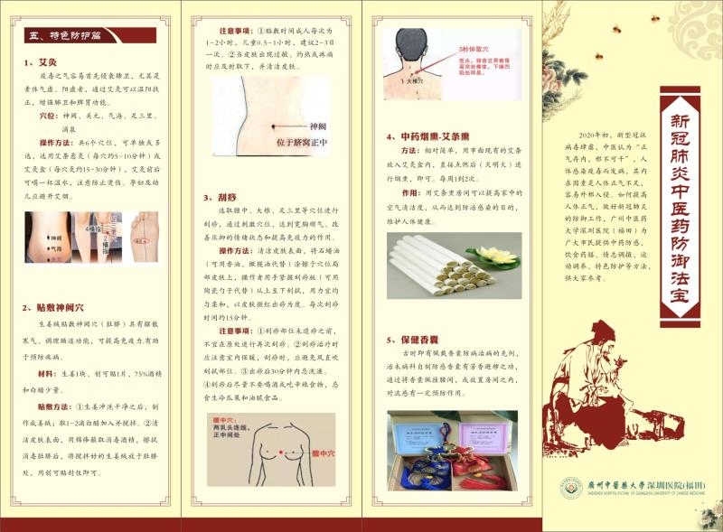 据张天奉介绍,中医认为“正气存内,邪不可干”,人体感染疫毒而发病,其内在因素是人体正气不足,容易外邪入侵。如何提高人体正气,做好新冠肺炎的防御工作,广中医深圳医院制作了《新冠肺炎中医药防御法宝》将在近日印发,派送到居民手中,指导市民运用中医药特色方法,从情志调理、起居调控、饮食调养、传统健身、中药防感、特色防护等方面助力防控工作,传授八段锦、经络拍打操、食疗药膳、中医按摩手法、穴位艾炙等养生保健方法,增强体质,提高防控效果。