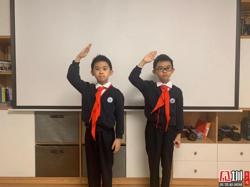 网上开学第一天,双胞胎学生穿好礼服、佩戴红领巾,庄严地敬礼。