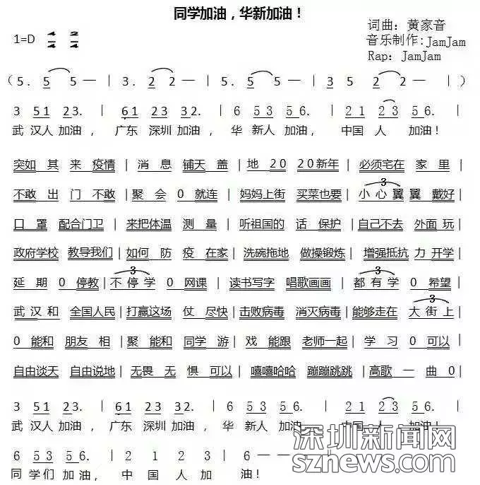 开学首日,深圳市福田区华新小学音乐教师黄家音作词作曲《同学加油华新加油》祝福武汉,叮嘱同学。