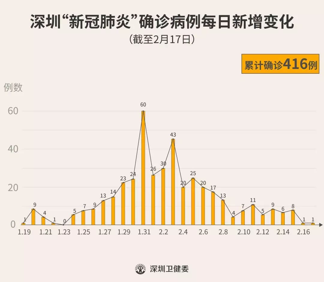 截至2月17日24时,深圳累计报告“新冠肺炎”确诊病例416例。2月17日当天全市新增确诊病例1例(个案详情今晚公布)。