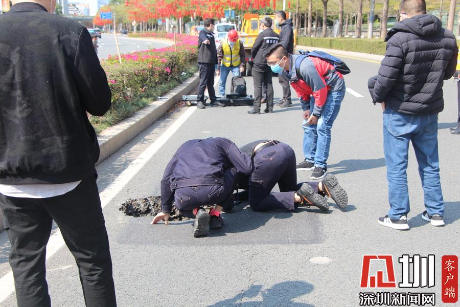 上午10点40分,记者在现场看到,该路面有一个直径约一米、深约一米的坑口,旁边还有一道长约20米的裂痕。工作人员正在使用雷达仪器对地面情况进行勘测,同时该路段及靠深南大道一条车道已暂时被封锁,福田区交警大队也在现场指挥交通。据悉,该位置较临近的地铁2、3路线的站点,一位深圳地铁的工作人员告诉记者,目前该事故没有对其线路运行造成影响,也非先前修挖地铁所致。
