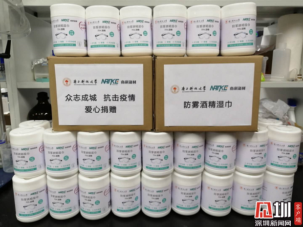 据悉,首批捐赠的护目镜防雾酒精湿巾数量为6000张(100桶)。该湿巾由孙大陟和南科大首届毕业生张至共同发起创立的深圳南科新材科技有限公司和孙大陟课题组共同紧急研发赶制,简单擦拭后可保证护目镜镜片长时间不起雾,对人体人眼无毒无害,且能起到有效消杀病菌作用。每片湿巾可至少擦拭一副护目镜,防雾效果可至少持续一天,大大节省了医护人员清洁装备的时间,为争分夺秒抗击疫情提供了有利条件。