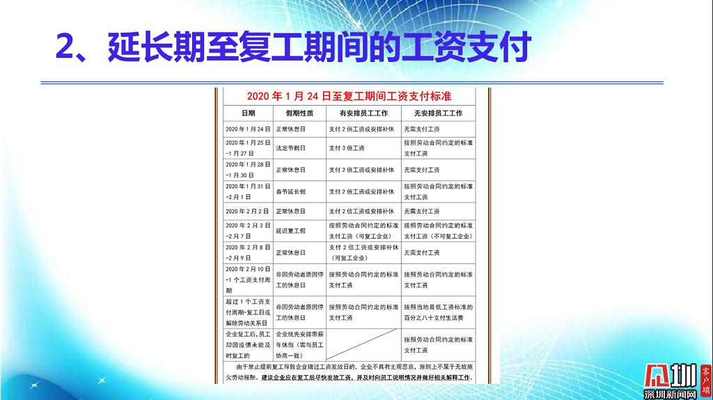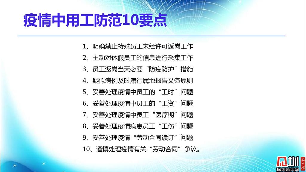 见圳客户端•深圳新闻网2020年2月18日讯(见圳客户端、深圳新闻网记者 焦慧茹)疫情影响了社会的方方面面,给企业和职工带来了新的问题。对于广大职工而言,担心的是疫情期间工资发放、复工安排等。对于企业而言,担心的是如何顺利复工复产。为此,深圳市总工会联合深圳新闻网推出“复工防疫微课堂”第六期,邀请讲师杨文浩,分析、整理了疫情之下企业复工用工防范要点,帮助大家解决困惑。