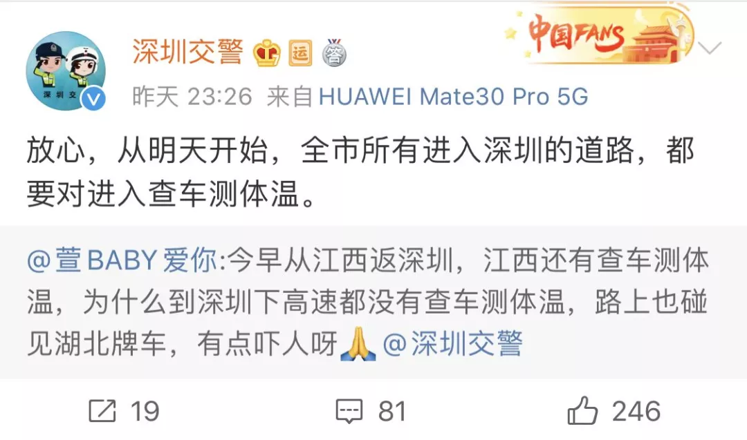 深圳交警表示,全市所有进入深圳的道路都要对进入的车辆查车测体温。