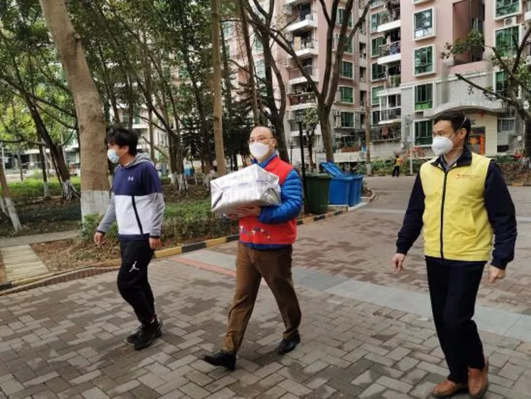 罗湖区东晓街道东晓社区某大厦出现确诊病例后,志愿者何洪斌每天组织八九个人的义工服务队对居家医学观察人员进行服务。