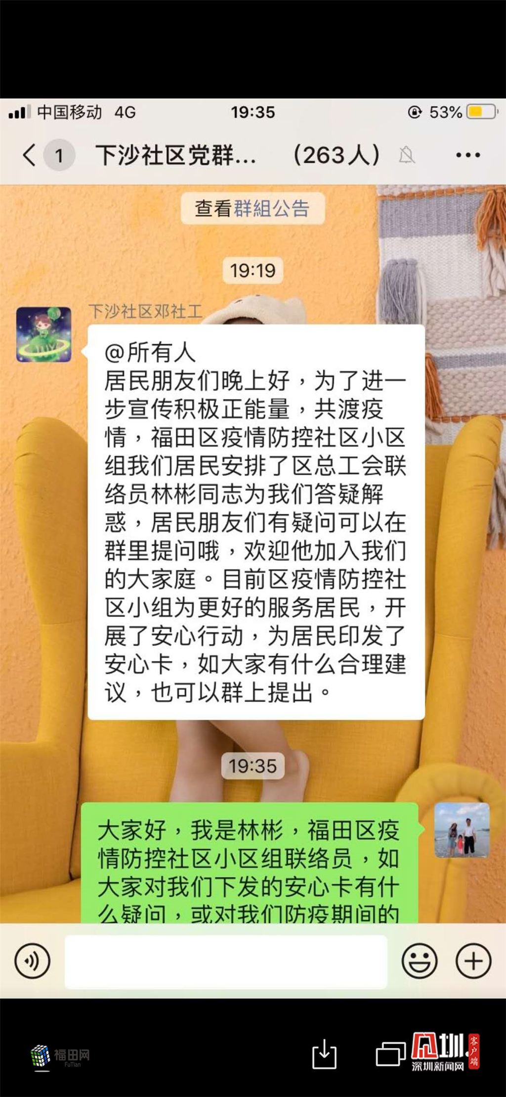针对居民最关心自己居住的小区是否有确诊病例、有无疑似病例、有无居家隔离人员的困惑,特别是出现了确诊病例小区的居民更迫切想了解本小区采取了哪些防疫措施保证居民安全。福田区安心行动第一条就是实施小区(村)疫情防控每日一播报机制,每个重点小区,工作组安排一名处级干部和一名科级干部化身安心联络员,进到小区业主群,督促配合小区物业管理处按指定模板公告今日疫情防控播报,保障居民知情权,同时听取收集居民对防疫的意见建议,协调联系解决,并反馈落实结果,对不能马上解决的做好解释说明。