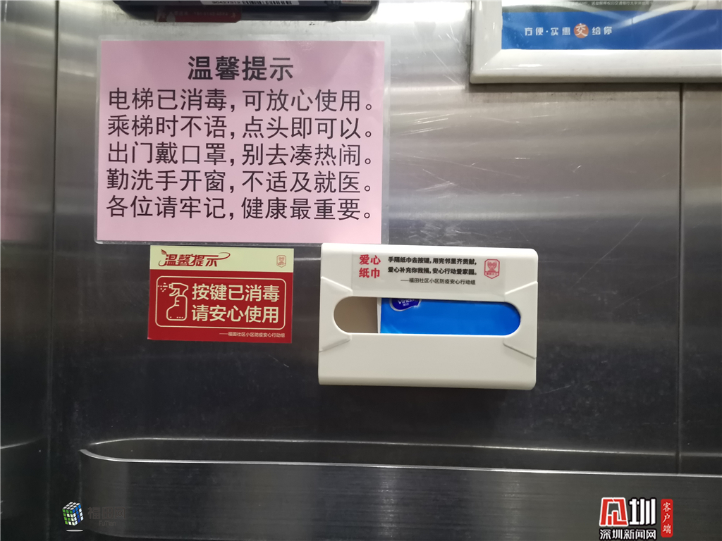 除了落实“五个100%”、“十个一律”等社区联防联控硬核举措外,福田区安心行动细微之处见真章,工作人员模拟小区居民,从出家门开始到小区门口,所必经的区域进行实地感受,督促配合物业对小区防火门、电梯内外、楼道、楼梯扶手、大门把手、公共座椅等公用设施每日消毒并公示记录,电梯间统一设置按键公用纸及纸巾回收处等一些小细节,让居民能看见实实在在的防疫措施而感到放心、安心。
