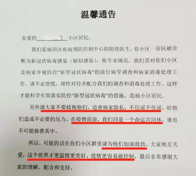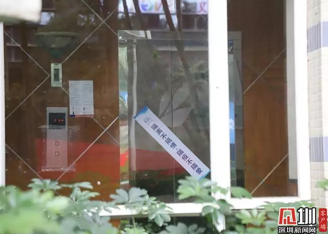 深圳南山一小区单元出入口,隔着玻璃看去,电梯上的封条写着“隔离不隔情、隔疫不隔爱”的温馨提示。