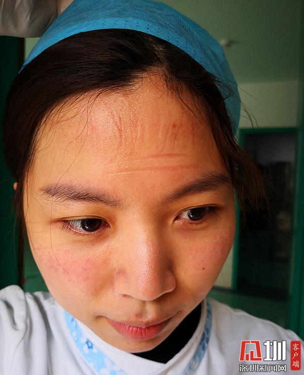 晚上9点,采样结束后回到社康的朱芷涵,脱下厚厚的防护服,头发像刚洗过一样每一根都在滴水,手早已被汗水浸出了褶子,脸上一圈深深的勒痕,咕咕作响的肚子在提醒她原来她还没有吃晚饭。乐观善良的涵妹妹笑着说“等疫情结束,也许我就减肥成功了”。
