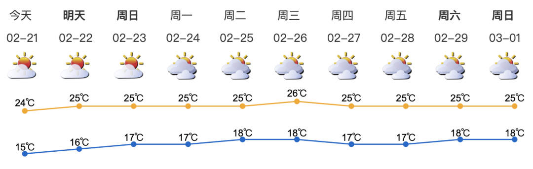 我市晴天间多云,空气干燥;气温15-24℃;东风3级;相对湿度45%-75%。