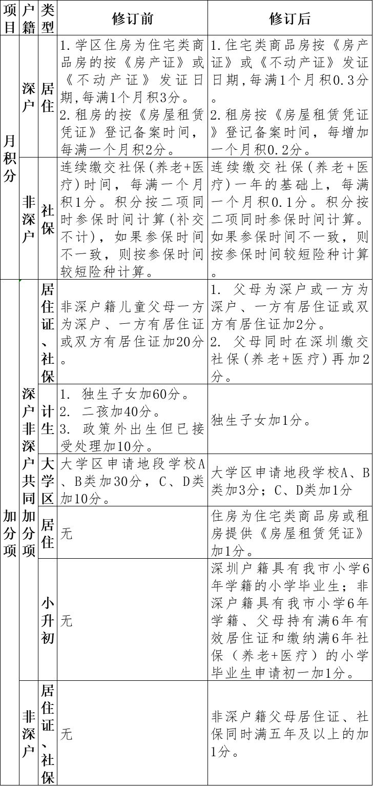 (3)非深圳户籍儿童父母为深圳户籍或双方有居住证或一方有居住证另一方为深圳户籍由原来加20分调整为2分;同时,加分对象由非深户调整为所有申请儿童。