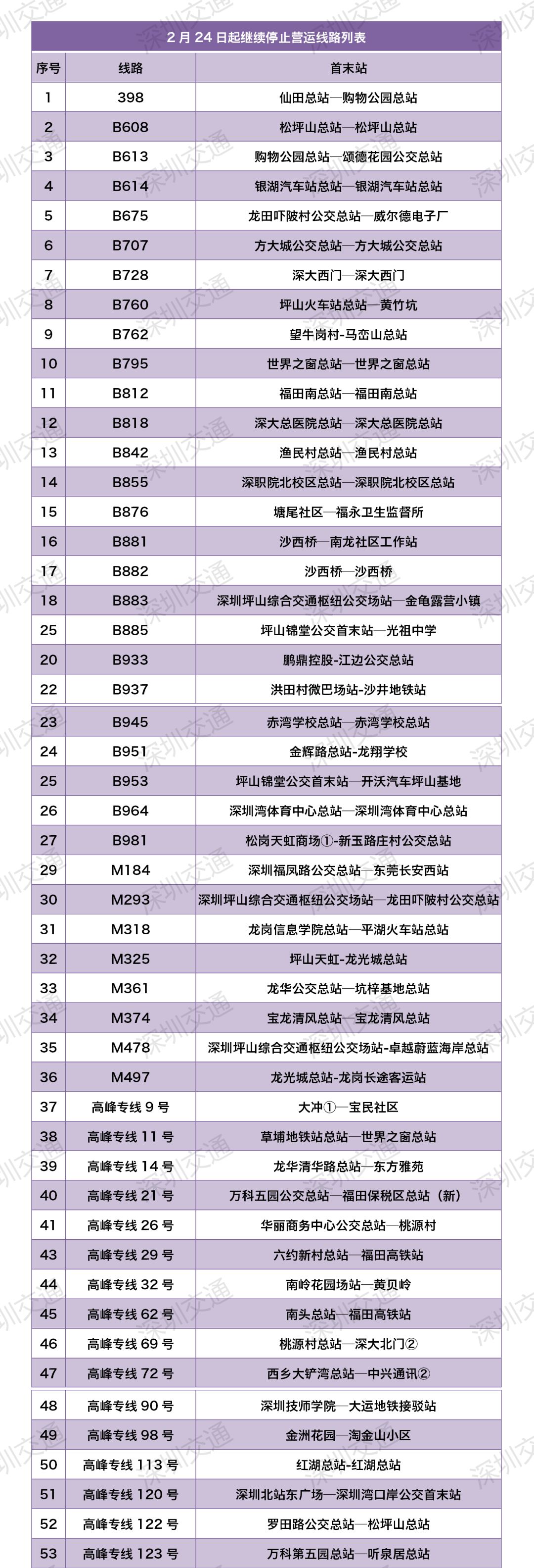 见圳客户端·深圳新闻网2020年2月21日讯 据深圳交通微信公众号消息,根据国家、省、市针对节后复产复工相关要求,结合目前新型冠状病毒疫情防控需要及行业实际情况,经研究↓2月24日起,深圳除以下114条公交线路外,其他公交线路恢复正常运营: