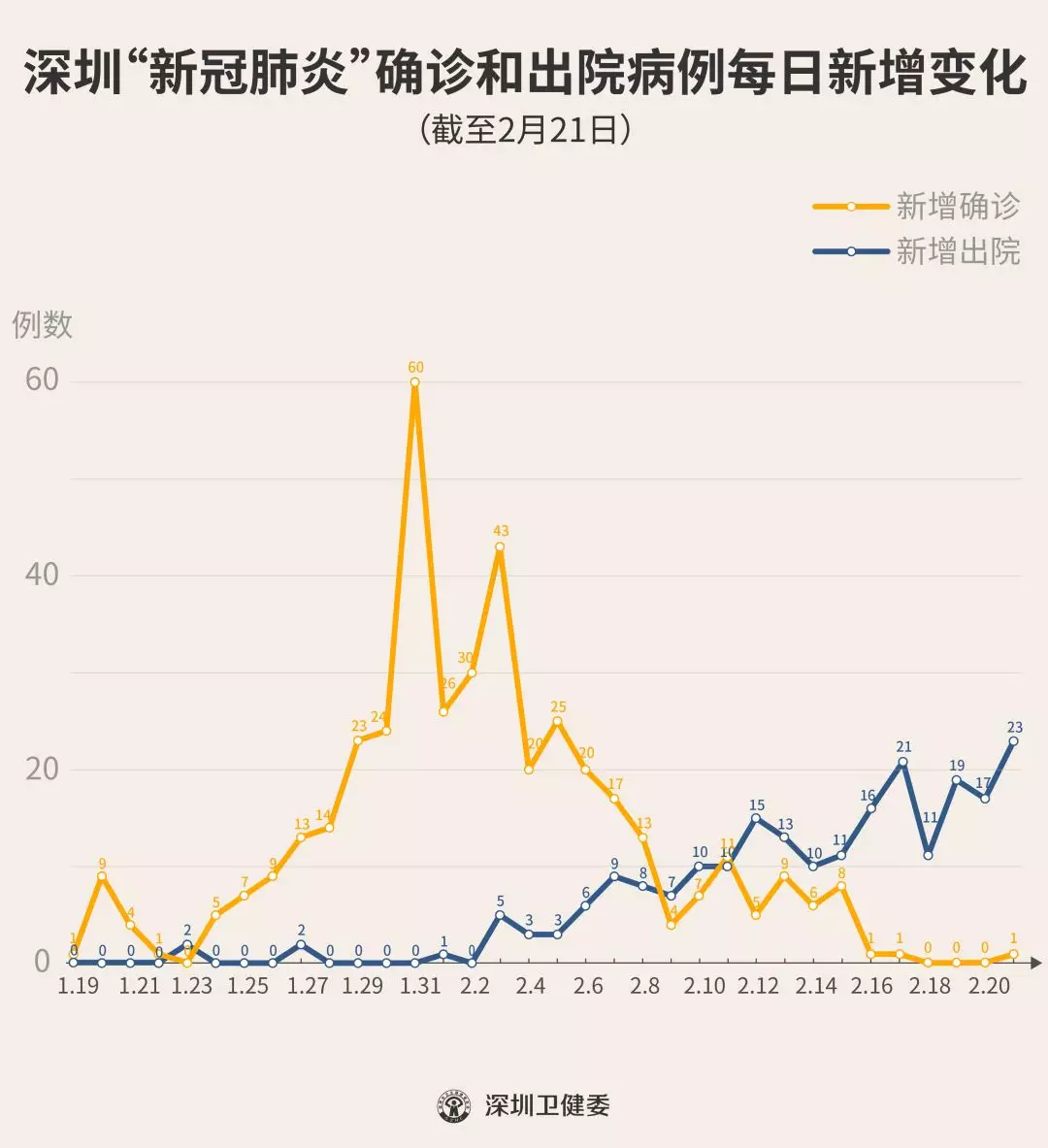 截至2月21日24时,深圳累计报告“新冠肺炎”确诊病例417例。2月21日当天全市新增确诊病例1例(个案详情今晚公布)。 ▲新增出院病例已超过新增确诊病例 累计报告确诊病例中,男性197例、女性220例。 按照病例管理地区划分,南山区87例、福田区81例、龙岗区71例、宝安区62例、龙华区34例、罗湖区32例、光明区11例、坪山区7例、盐田区6例、大鹏新区2例、其他(指由机场、车站、码头、关口、路卡等直接送往定点医院的)24例。 目前,重症10例、危重症9例,死亡2例,累计出院222例。 193例确诊病例均在深圳市第三人民医院隔离治疗。 202例密切接触者正在接受医学观察。 资料来源:深圳市疾控中心、深圳市卫健委、广东省卫健委