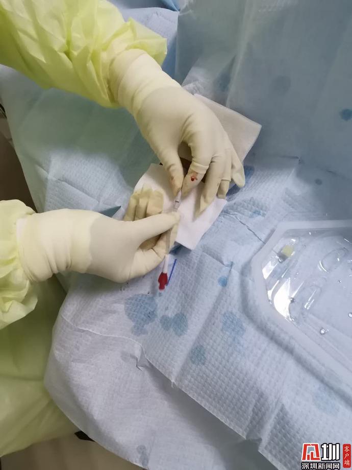 王玲是静脉专科治疗护士,另一名队员陈洁丽也是持有 PICC 资格证的护士。尽管都有上十年的经验,对于此次操作两人还是非常谨慎。王玲说,防护服带来的影响,尤其会体现在手感上。戴上几层手套后,手感会变差。受限于当地设备,可能不能靠仪器去协助穿刺,要执行 " 盲穿 ",纯凭自己的经验去完成,是一个挑战。等下先评估下血管条件,希望一切顺利,为病人减轻痛苦。