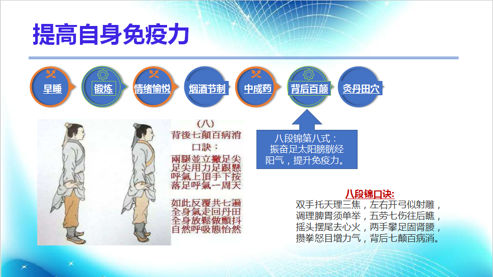 6.背后百颠:背后百颠从养生方法“八段锦”演化而来,口诀如下:双手托天理三焦,左右开弓似射雕,