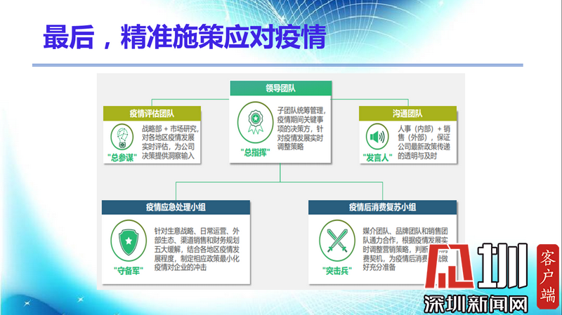 疫情期间,完善领导团队统筹管理,作为“总指挥”,即关键事项的决策方,能够针对疫情发展实时调整企业应对策略;构建疫情评估团队即“总参谋”,对各地区疫情发展实时评估,为公司决策提供洞察收入;完善“发言人”机制,建立沟通团队,确保公司最新措施能够及时、准确、透明传递给每一位员工;建立疫情应急处理小组作为“守备军”,针对公司生意战略、日常运营、外部生态、渠道销售和财务规划五大环节制定相应政策,最小化疫情对企业的冲击;成立疫情消费复苏小组,公司内媒介团队、品牌团队和销售团队通力合作,根据疫情发展实时调整营销策略,判断反弹消费契机,为疫情后消费回流做好充分准备。