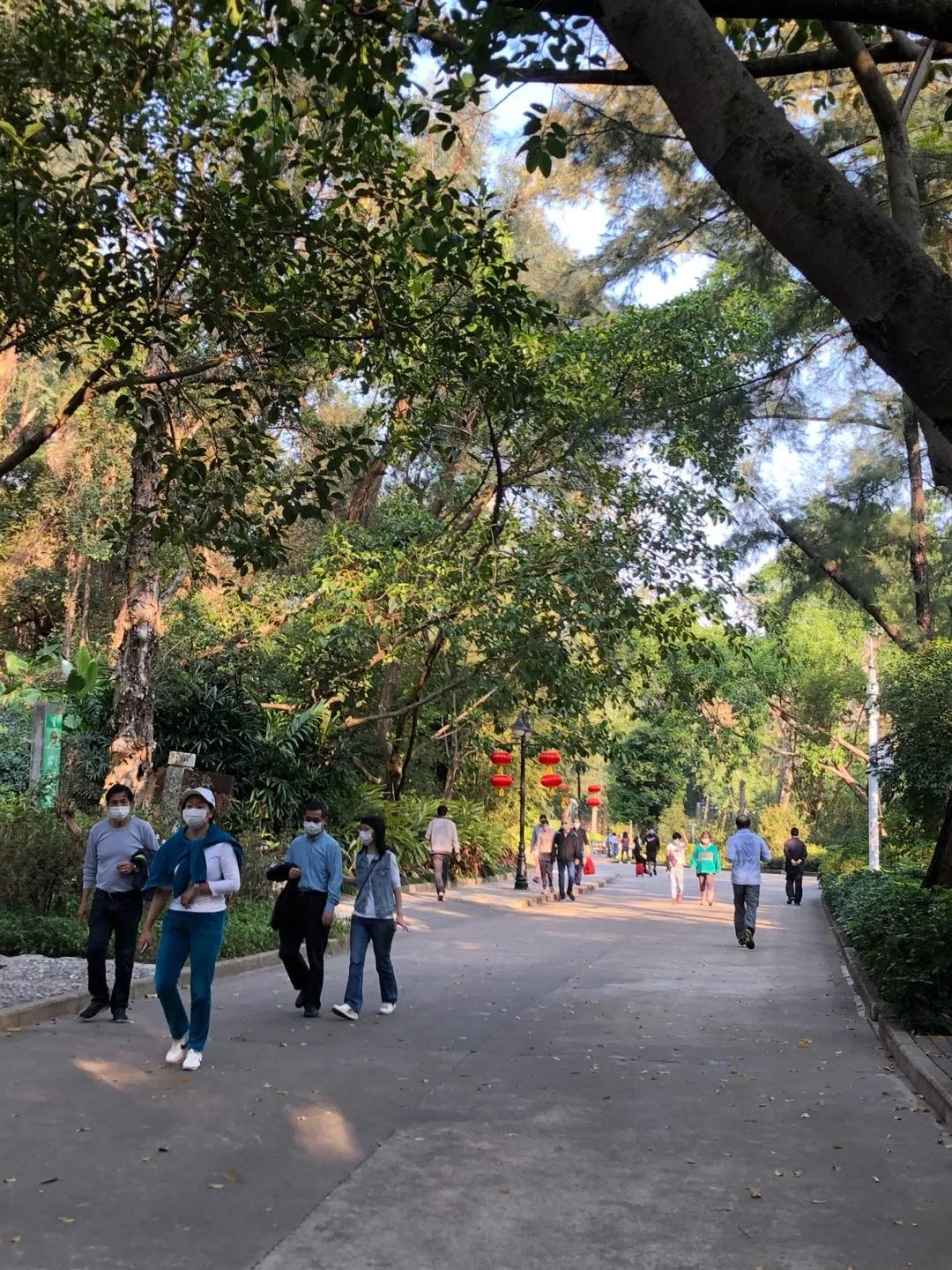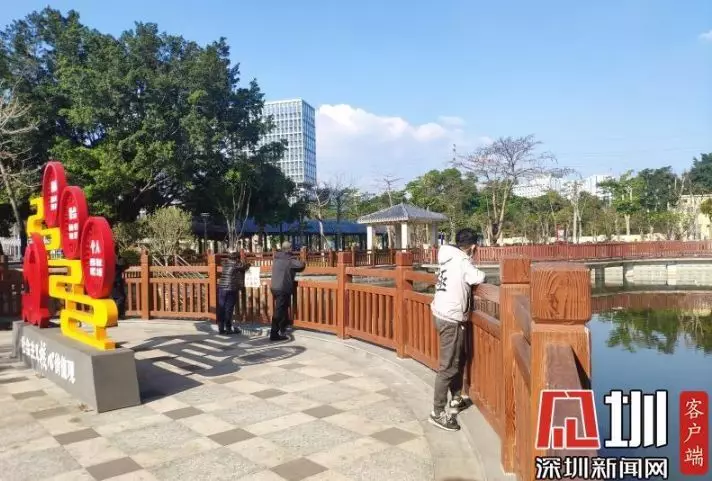 在光明区塘家公园,每隔一小段距离,就有零星几个当地的群众,在公园的池塘边观赏风景,散散心,均有佩戴口罩。