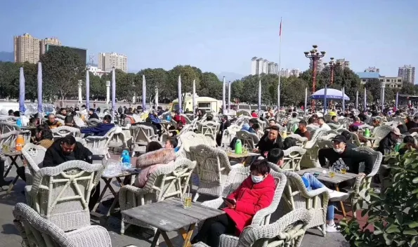 ▲2月21日,四川广元不少人出门晒太阳。在利州广场,市民扎堆喝坝坝茶,一市民拍视频称现场人山人海。