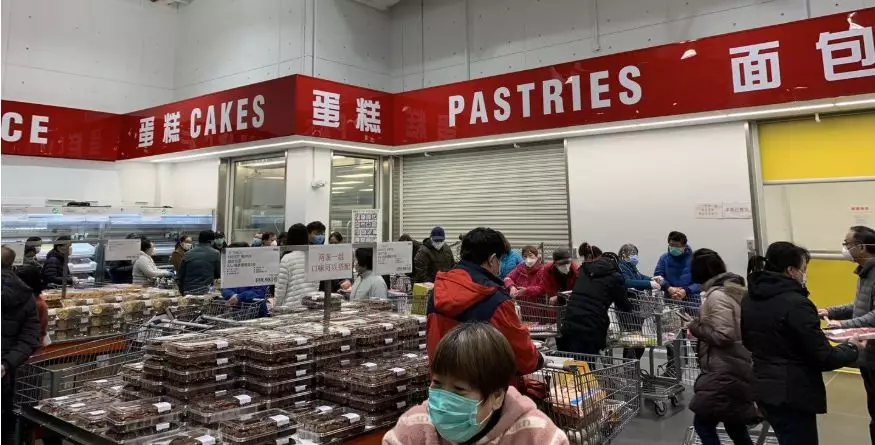 ▲这两天,位于上海闵行区的Costco超市里,购物的人们又排起了长龙。