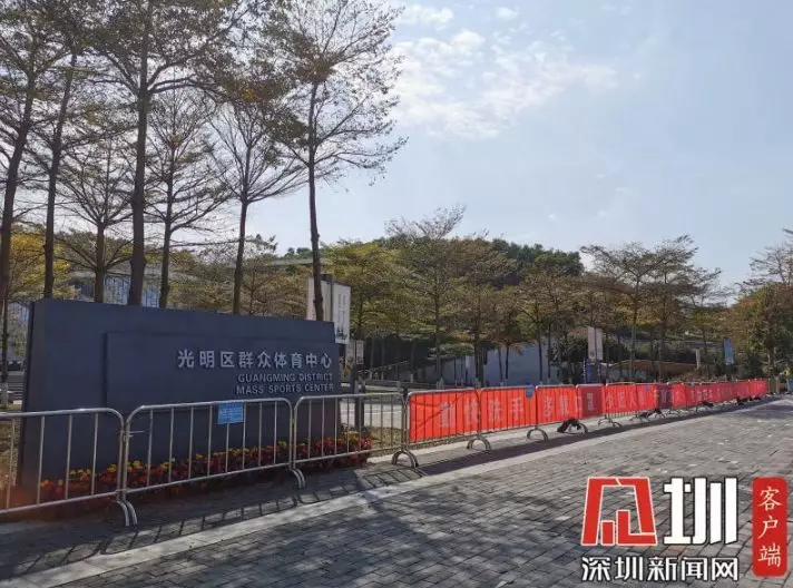 光明区群众体育中心大门口被铁马围着,只留下一处小门,一旁有保安值守。看记者上前,他赶紧劝诫道:“如果没有重要事情就不要进去了,现在馆内无活动。”