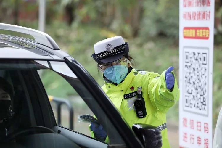 民治街道上芬社区网格员在卡点为进出人员进行体温检测。