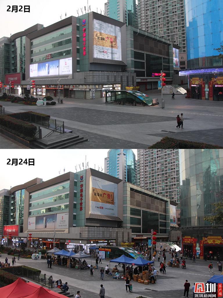 上图为2月2日,人迹罕见的华强北电子商业街,下图为2月24日,华强北电子商业街人流量已有明显增多。