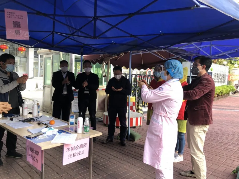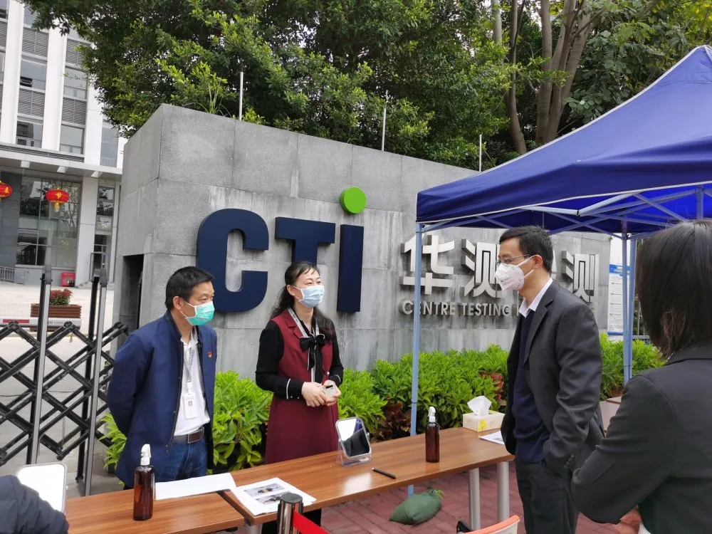 随后,集团社康管理中心负责人和兴东社康医务人员到社区内的重点企业——华测检测认证集团股份有限公司,开展复工复产防疫工作,指导管理人员学习如何正确戴口罩、洗手、测体温,口罩回收注意事项、如何避免登记人员信息时感染等等。