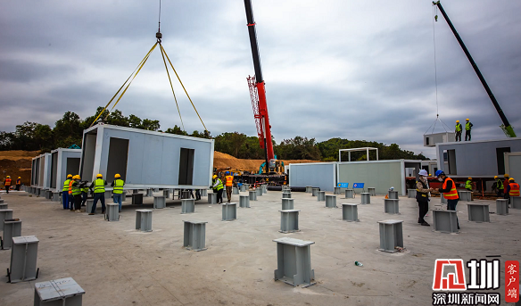 中建科工应用B IM技术、智慧工地平台,开启“时间不断、空间占满”的满负荷、急行军模式。如开辟第二现场——拼装场地等。7天,以极限速度完成9.2万平方米的场地清表、土方挖运、级配碎石施工、底板钢筋绑扎及混凝土浇筑;7天,完成现场2560个箱体的现场吊装;7天,完成1000个床位的室内装饰、6.8万平方米的室外管网及绿化施工。各项工作交叉进行,20天内建成了深圳应急医院项目。