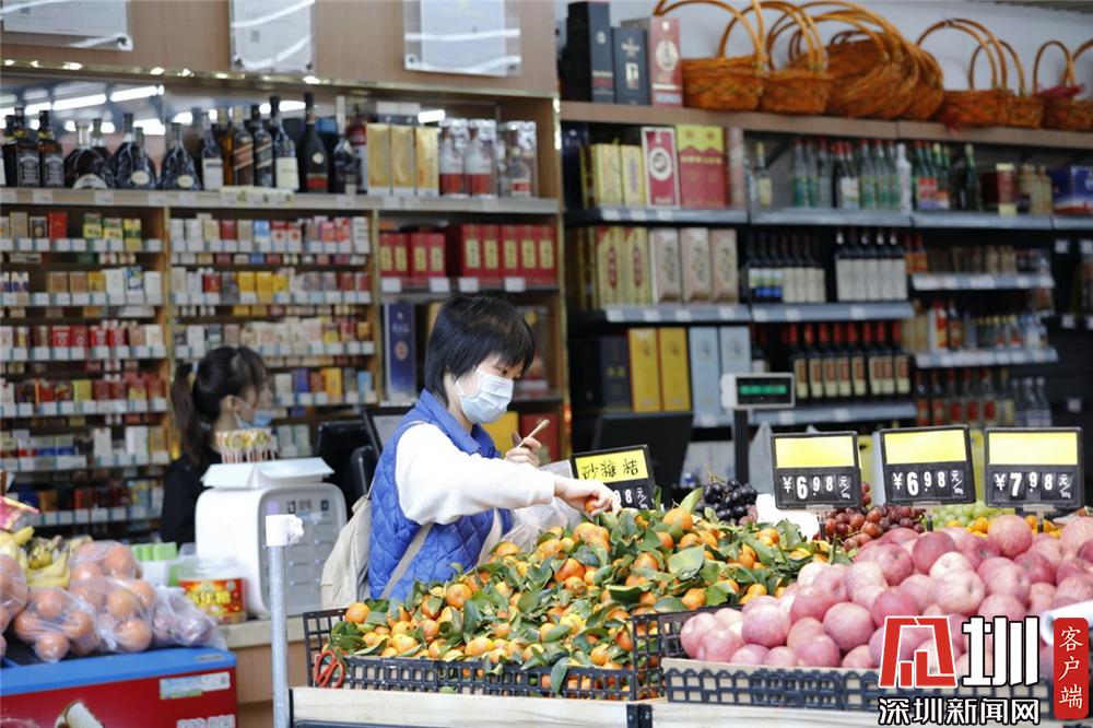 一个水果店中,一位戴着口罩的市民正在选购水果。