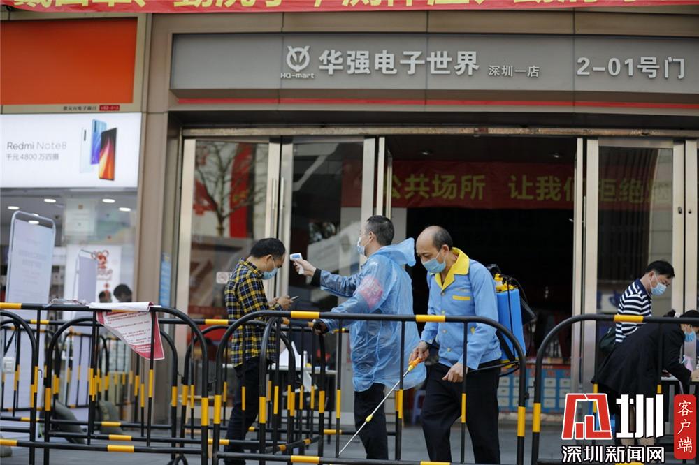 华强电子世界深圳一店入口,工作人员正在为入场者测量体温。