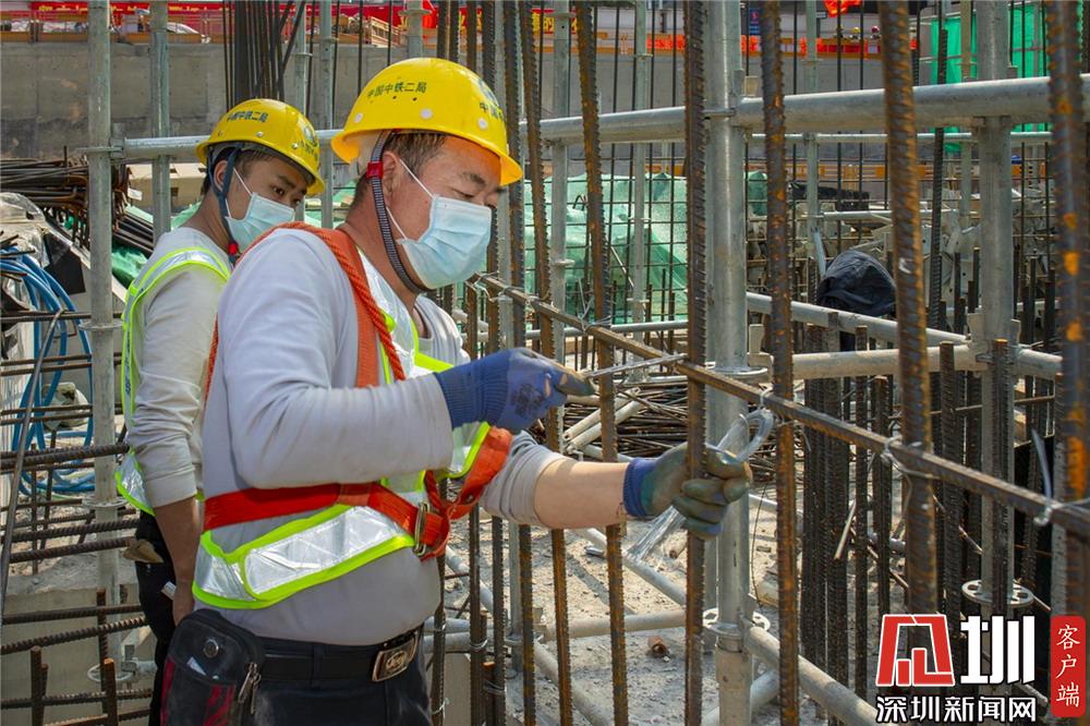 岗厦北地铁施工工地,工人们佩戴好口罩进行施工。