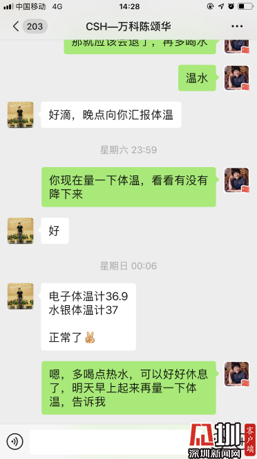 ·西丽社康医务人员协同物业管理处,建立居家隔离的沟通微信群,住户每天上报体温,如有异常,安排社康工作人员上门排查,联络工作站人员联系120转诊。
