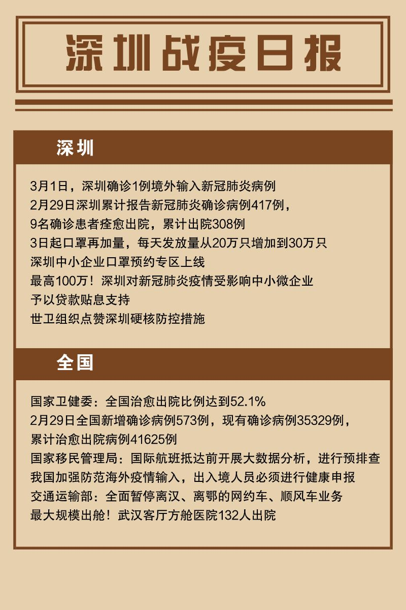 ②3月1日,深圳确诊1例境外输入新冠肺炎病例,患者孙某,男,35岁,现居住于深圳市福田区福保街道红树福苑,近两年在英国布里斯托工作。截至2月29日24时,深圳累计报告“新冠肺炎”确诊病例417例。2月29日当天全市无新增确诊病例,当天出院病例9例。