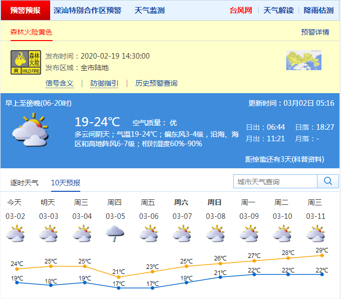 见圳客户端·深圳新闻网2020年3月2日讯 深圳市气象台预计,3月2日深圳多云,有零星小雨,气温19-24℃,东北风3-4级,沿海、海区和高地阵风6-7级;3日多云间阴天,有零星小雨;4日多云间阴天有小雨;5-6日阴天到多云有小雨或零星小雨,气温略微下降;7-9日多云,气温逐日回升。