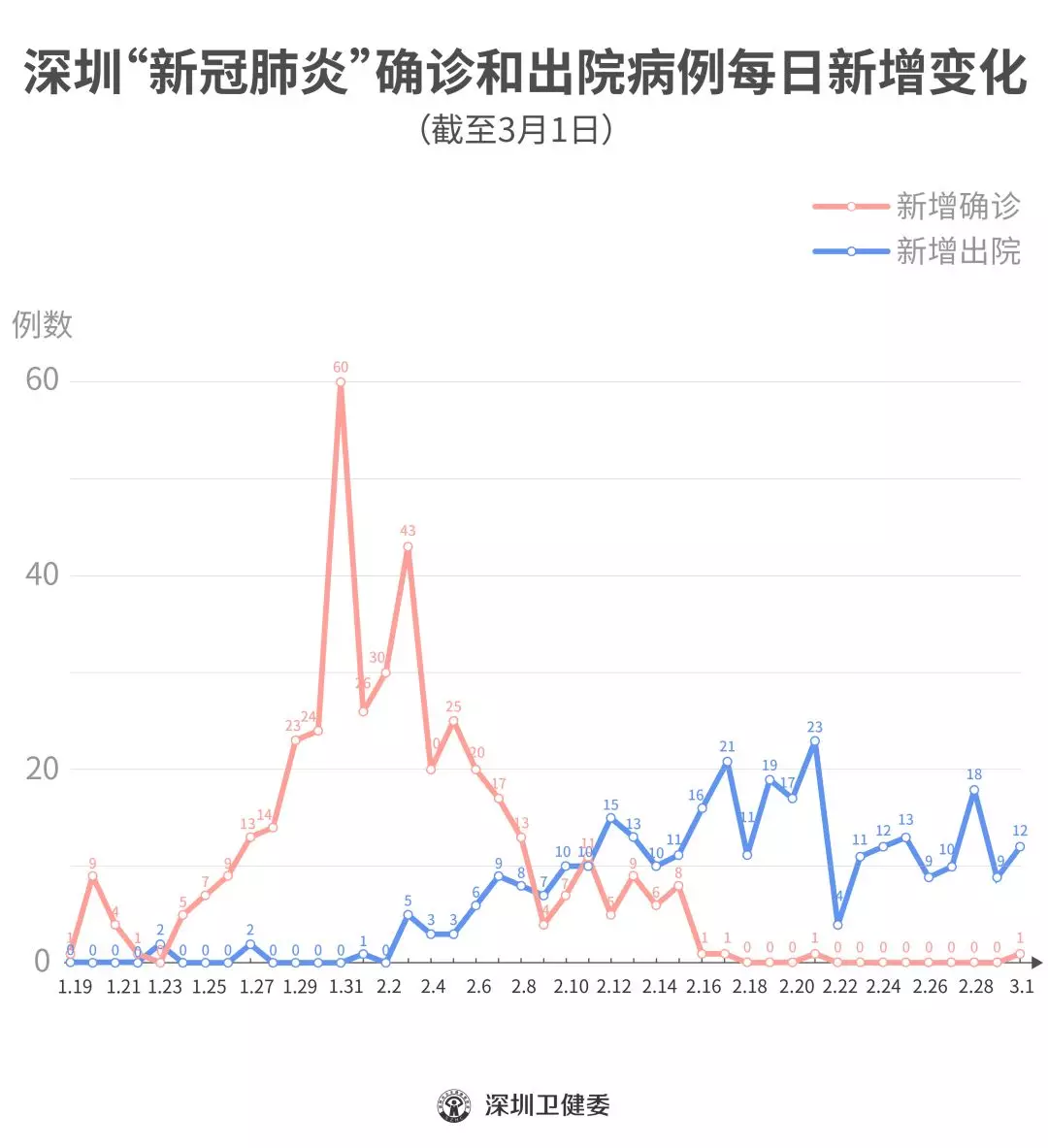截至3月1日24时,深圳累计报告“新冠肺炎”确诊病例418例。3月1日当天全市新增确诊病例1例,当天出院病例12例(从2月26日起不再公布出院个案)。 ▲新增出院病例已超过新增确诊病例 累计报告确诊病例中,男性198例、女性220例。 按照病例管理地区划分,南山区87例、福田区82例、龙岗区71例、宝安区62例、龙华区34例、罗湖区32例、光明区11例、坪山区7例、盐田区6例、大鹏新区2例、其他(指由机场、车站、码头、关口、路卡等直接送往定点医院的)24例。 目前,重症6例、危重症2例,死亡3例,累计出院320例。 95例确诊病例均在深圳市第三人民医院隔离治疗。 103密切接触者正在接受医学观察。 资料来源:深圳市疾控中心、深圳市卫健委、广东省卫健委