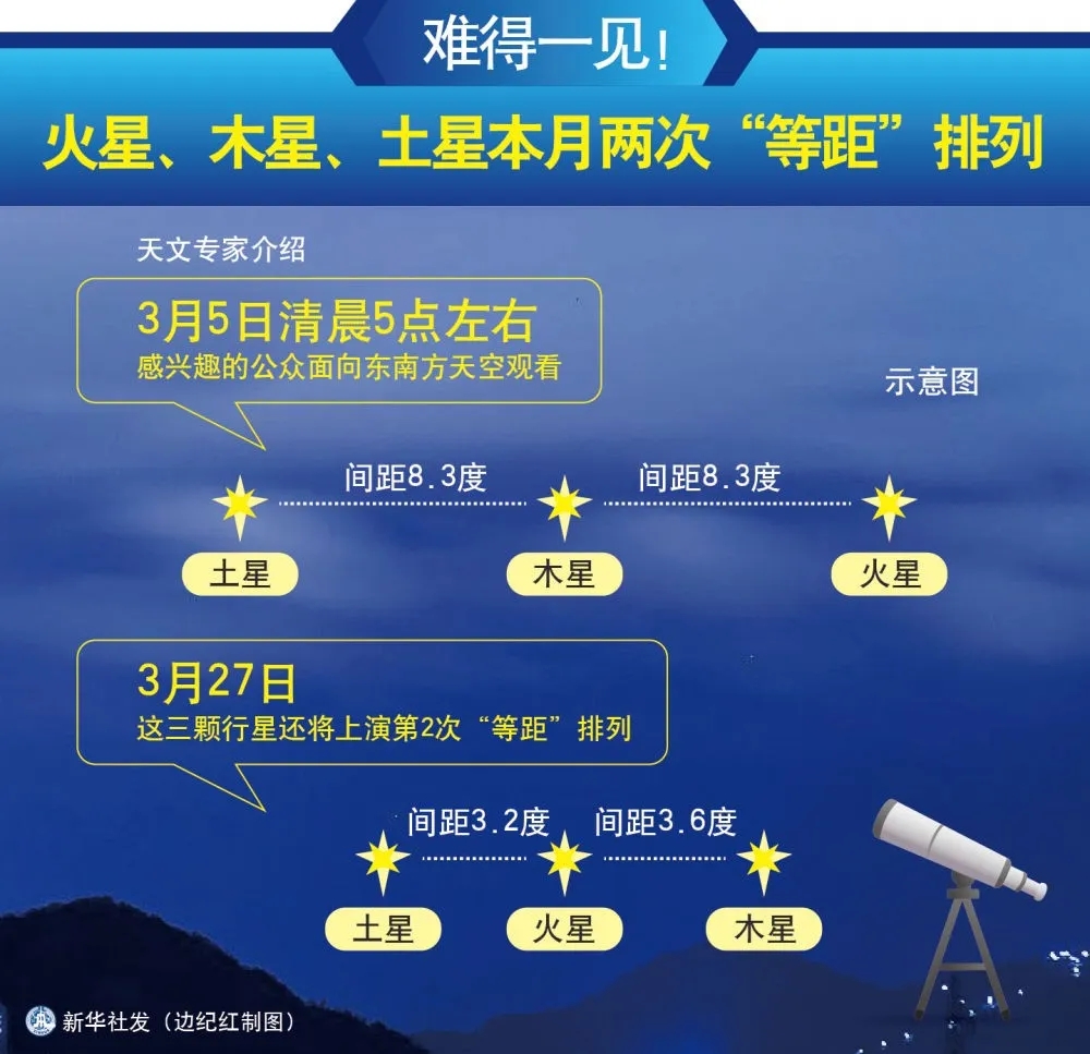 ①天文专家介绍,3月5日和27日,天宇将两次上演火星、木星、土星“等距”排列的罕见天文现象,感兴趣的公众不要错过。