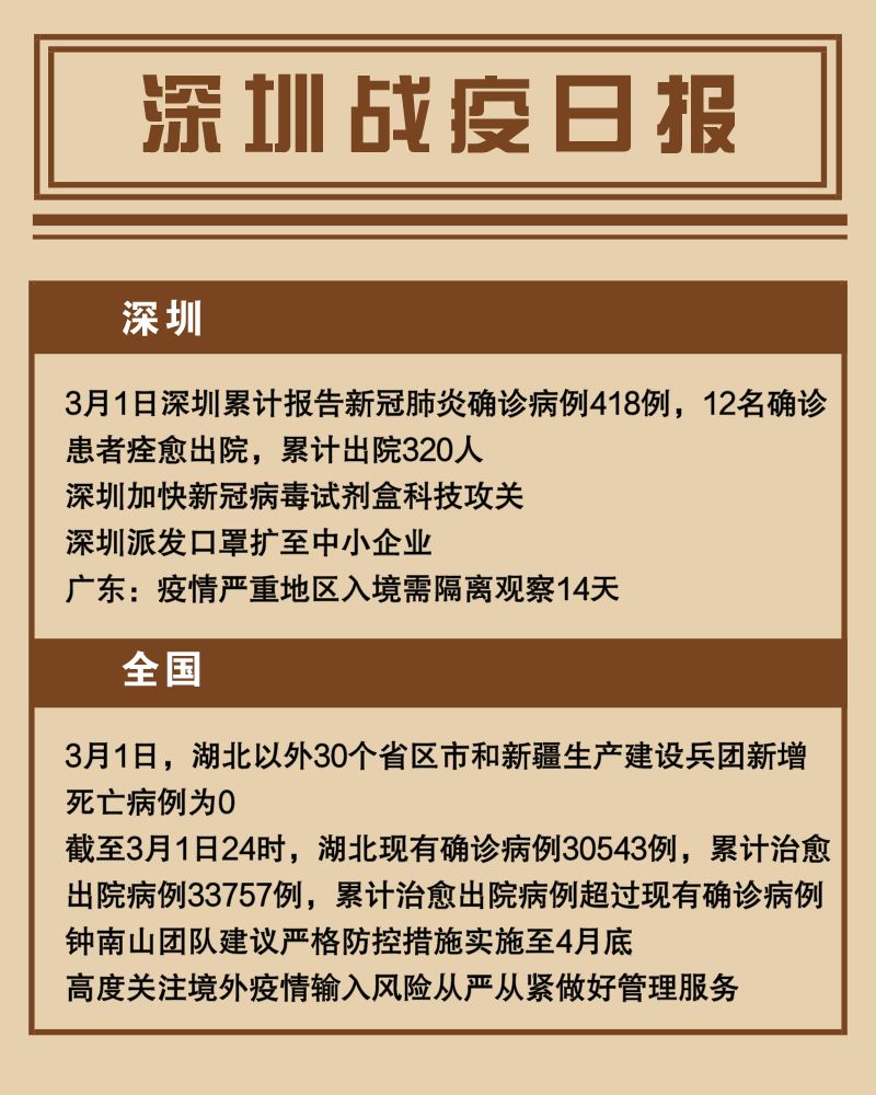 ②截至3月1日24时,深圳累计报告新冠肺炎确诊病例418例。3月1日当天全市新增确诊病例1例,当天出院病例12例,累计出院320例。目前,重症6例,危重症2例,死亡3例。95例确诊病例均在深圳市第三人民医院隔离治疗。103名密切接触者正在接受医学观察。
