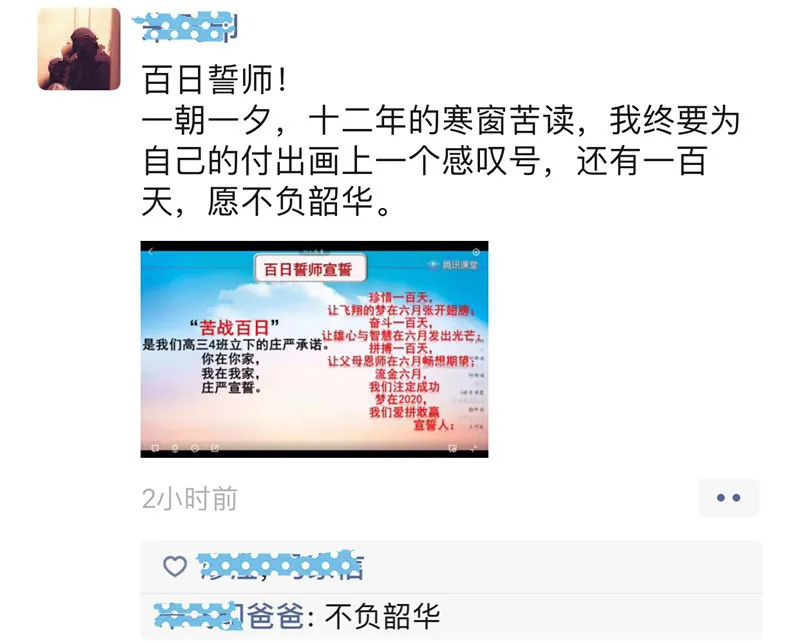 高三(10)班刘欣颐妈妈的留言也赢得了孩子们点赞:“亲爱的孩子们,在这最苦难时期,请坚持你们的奋斗目标和理想,不要退缩、勇往直前。许多事情,坚持坚持就过来了。人生就是一场修行,再苦再累,只要朝着自己努力的奋斗目标,属于你的终究会出现。不负韶华方得始终,梦想永远属于努力奋斗的人。加油吧,少年!”