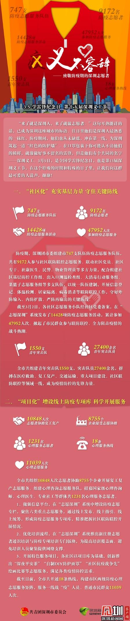 据了解,防疫期间,深圳团市委组建747支防疫志愿服务队伍,共9172人参与社区联防联控志愿服。截至3月2日,各社区志愿服务小队经社区党委备案,在“志愿深圳”系统发布了14428项防疫志愿服务活动,累计参加47952人次。在深圳战“疫”的关键时刻,全市共组建青年突击队1550支,突击队员27400余人,拼搏在医疗救助、复工复产、交通运输、重大项目建设、社区联防联控等领域一线,成为疫情防控的先锋力量。
