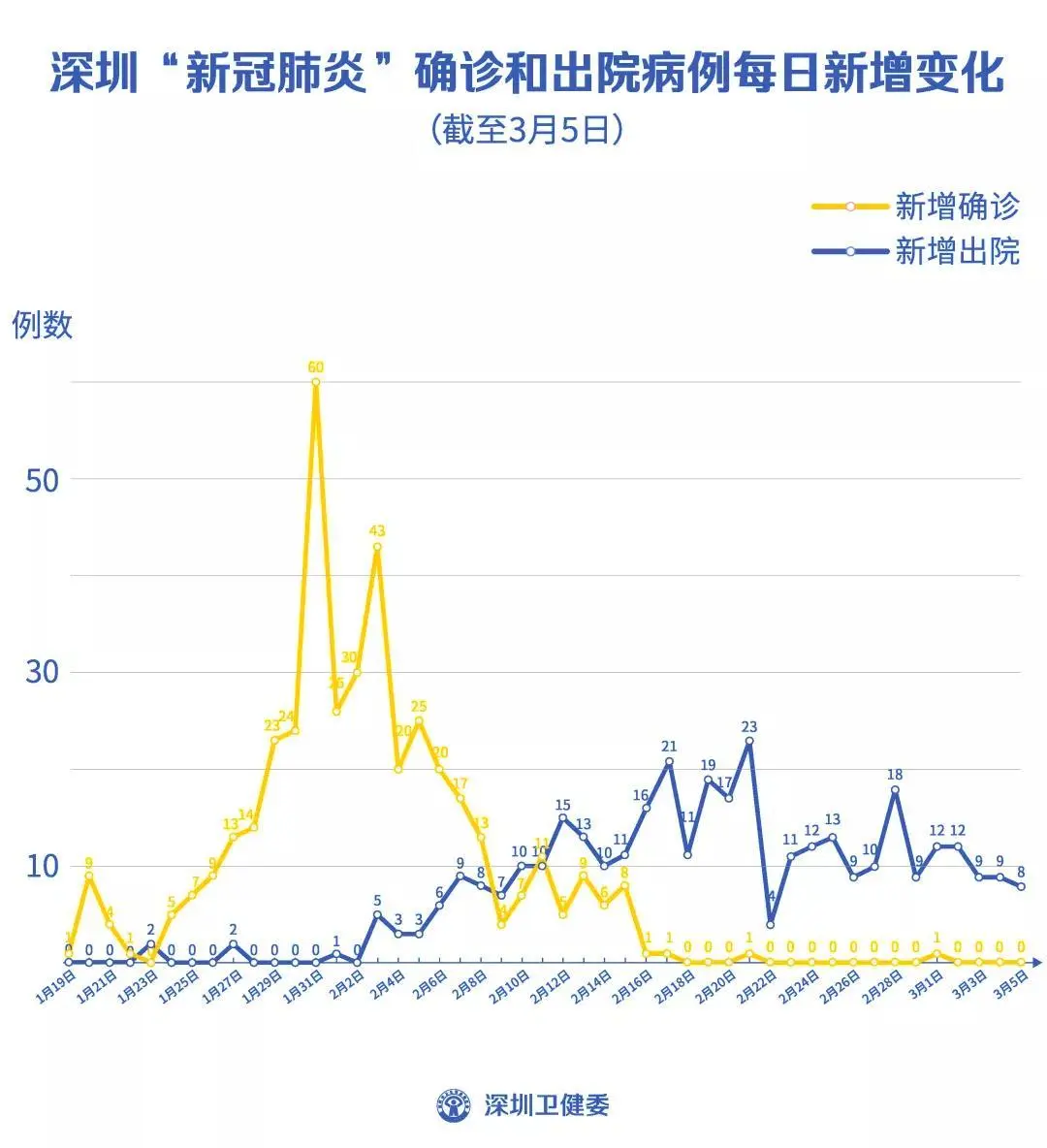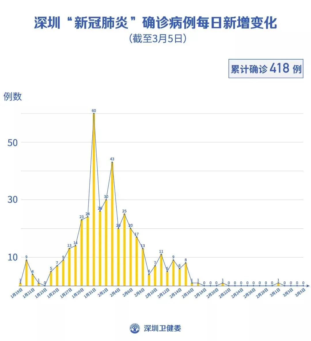 截至3月5日24时,深圳累计报告“新冠肺炎”确诊病例418例。3月5日当天全市无新增确诊病例,当天出院病例8例(从2月26日起不再公布出院个案)。 累计报告确诊病例中,男性198例、女性220例。 按照病例管理地区划分,南山区87例、福田区82例、龙岗区71例、宝安区62例、龙华区34例、罗湖区32例、光明区11例、坪山区7例、盐田区6例、大鹏新区2例、其他(指由机场、车站、码头、关口、路卡等直接送往定点医院的)24例。 目前,重症4例、危重症3例,死亡3例,累计出院358例。 57例确诊病例均在深圳市第三人民医院隔离治疗。 97例密切接触者正在接受医学观察。 资料来源:深圳市疾控中心、深圳市卫健委、广东省卫健委