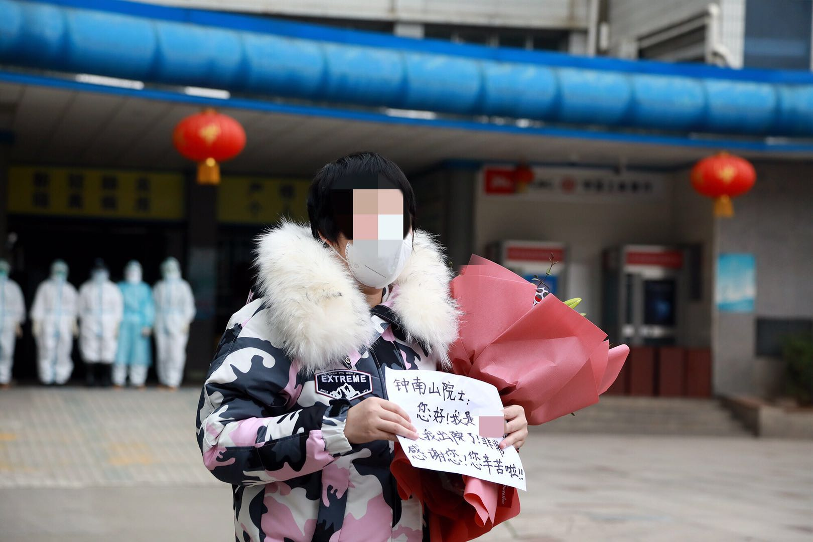 张冬雪走近后,面对记者的镜头,打开自己事先准备好的一张纸,上面写着“钟南山院士,您好,今天我出院了,非常感谢您,您辛苦啦!”