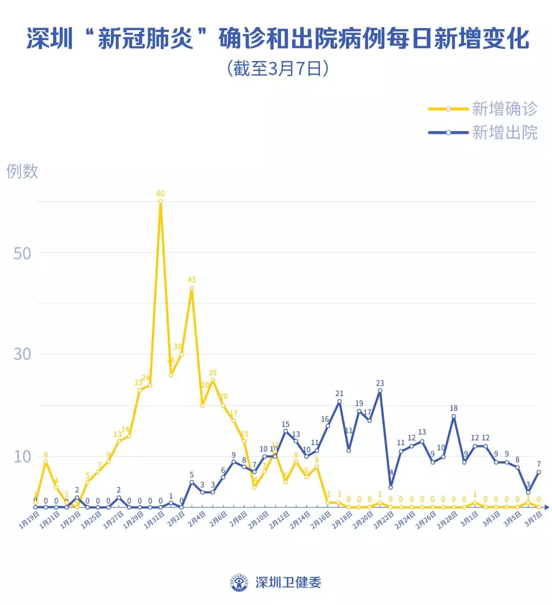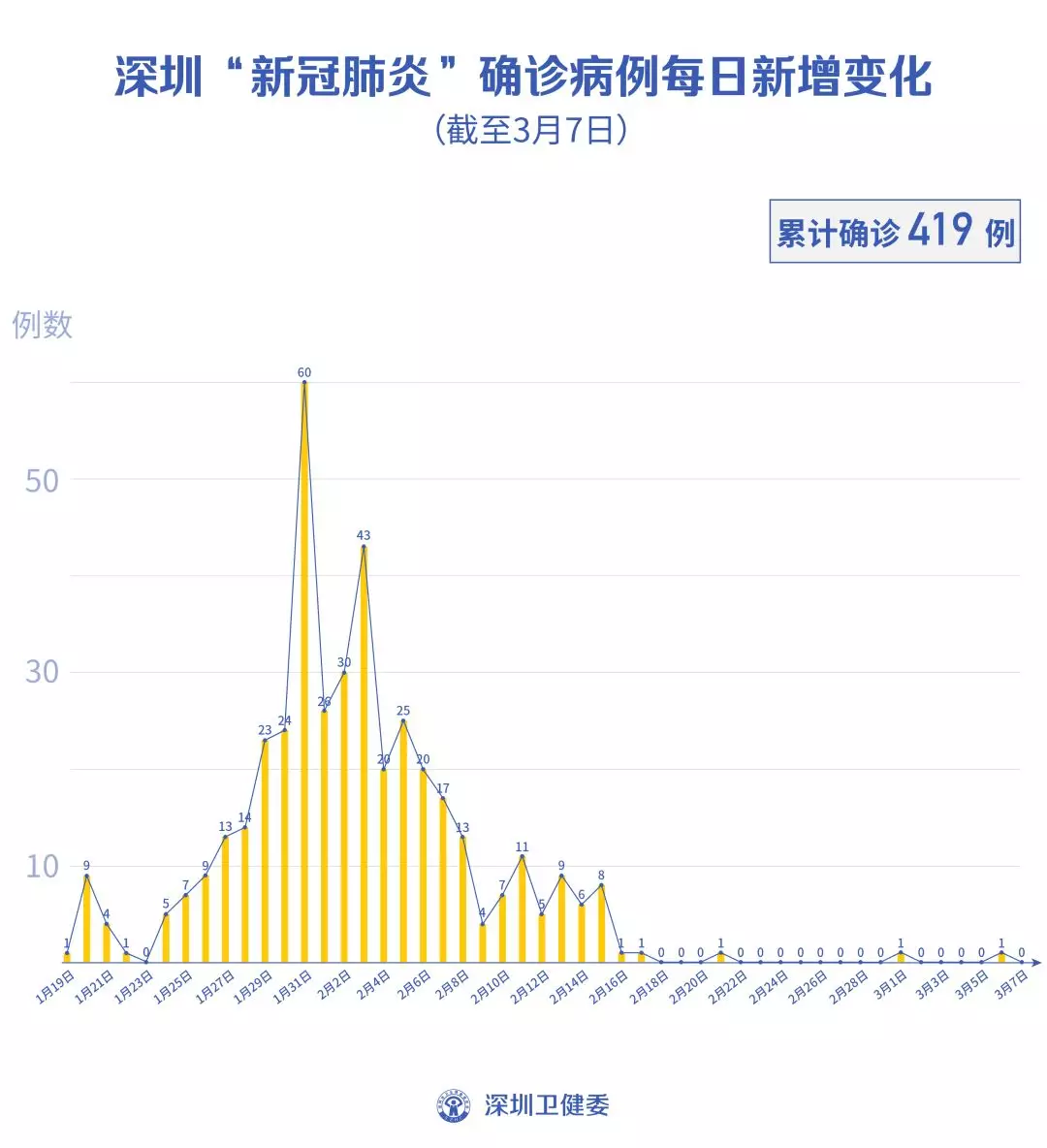 截至3月7日24时,深圳累计报告“新冠肺炎”确诊病例419例。3月7日当天全市无新增确诊病例,当天出院病例7例(从2月26日起不再公布出院个案)。