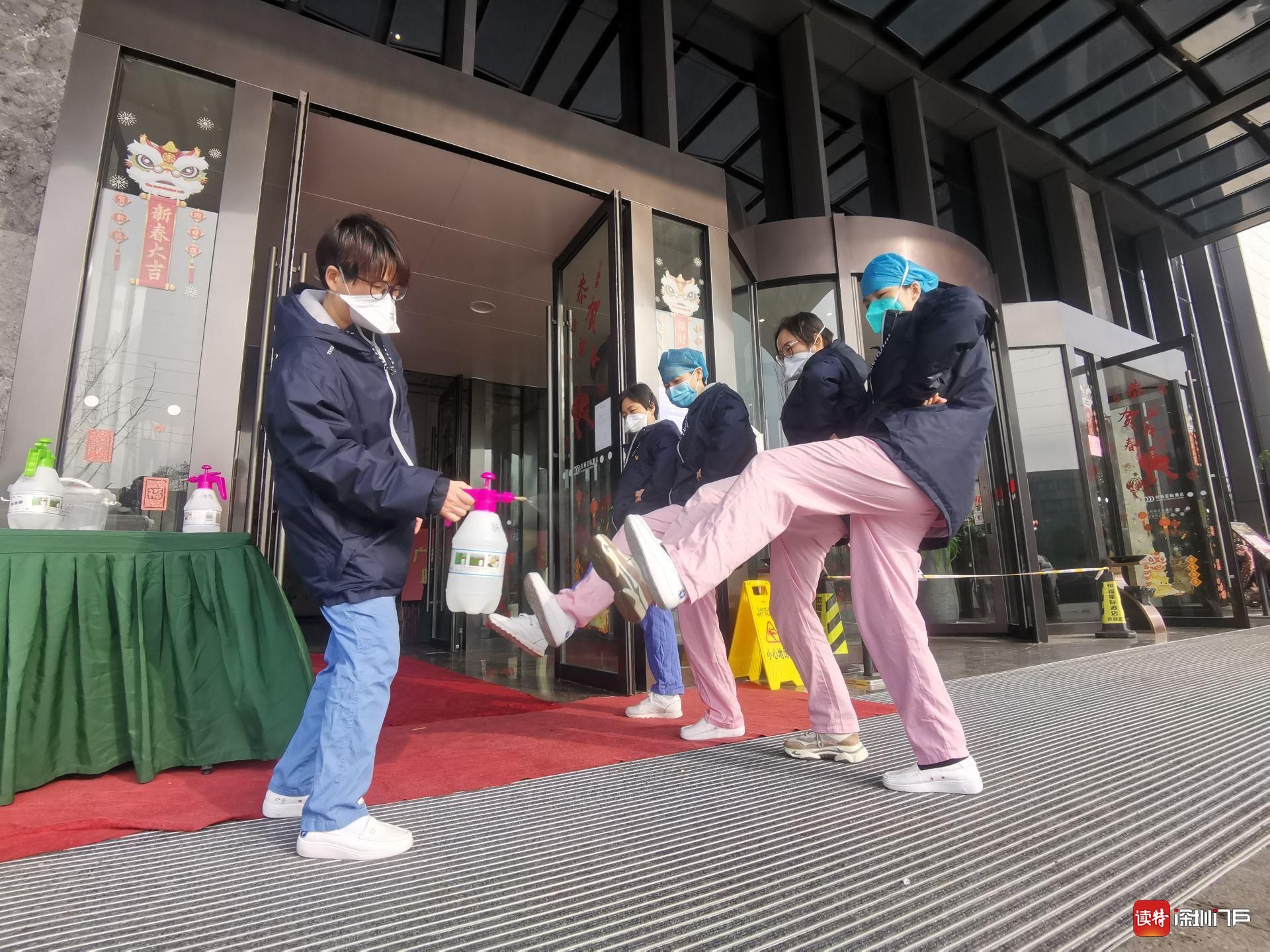 进入驻地酒店前,深圳医疗队队员列队用酒精进行鞋底消毒