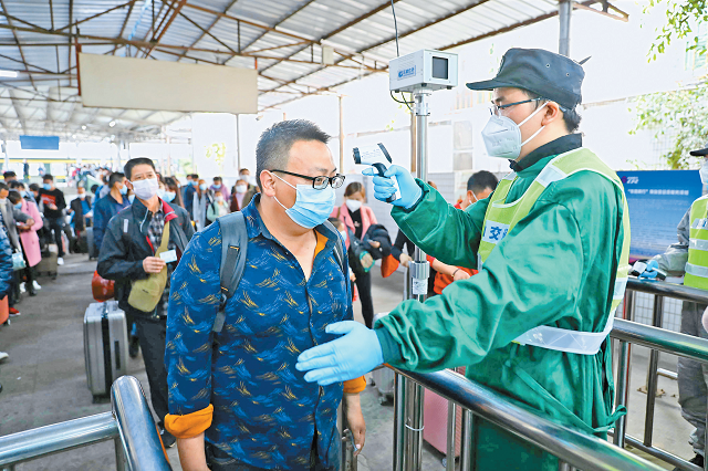平南铁路接到复工专列开行调度命令后高度重视,统筹安排车务系统做好接车准备,尤其是深圳西站为了方便复工专列旅客出站,开通四条出站通道,每条通道安排两名工作人员,一人负责测量旅客体温,一人负责检票,确保旅客快速出站。同时,开启红外线智能体温检测仪,做到智能与人工双结合,保证到达旅客体温检测达到百分百覆盖。(来源:深圳特区报)