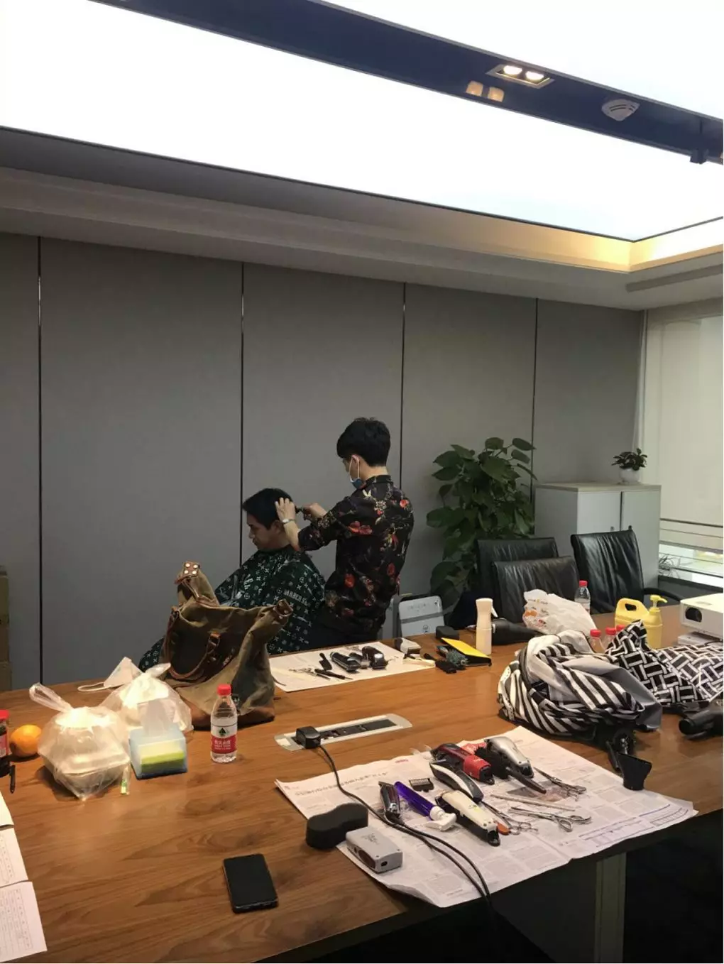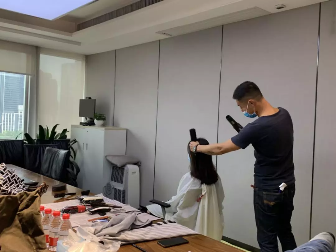 公司本部,1303会议室,临时理发室“生意”也火爆极了。公司工会邀请了两名专业的Tony老师,为近90名员工提供免费的理发服务。为减少人员聚集,理发采取提前线上预约,分时段进行,确保安全的同时,尽可能让有需要的同事都能理上发。铺上一次性地毯,坐上椅子,围上一次性“斗篷”,Tony老师一顿熟练的剪发操作后,再用吹风机整好造型,就完成了理发的全过程。临时理发师的搭建,有效解决了员工生活上的困难,帮助他们以良好的精神面貌投入工作来。