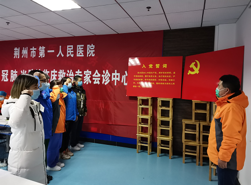 广东省支援荆州医疗队临时党委组织新党员宣誓活动主会场和部分分会场现场。 陈广泰 摄